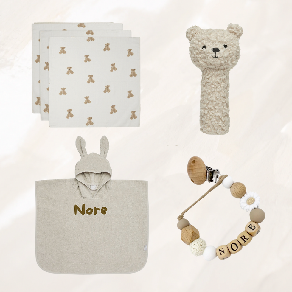 Wil je iets unieks geven? Kies voor een kraamcadeau met naam, zoals een gepersonaliseerde wikkeldoek of een speenkoord met de naam van de baby.